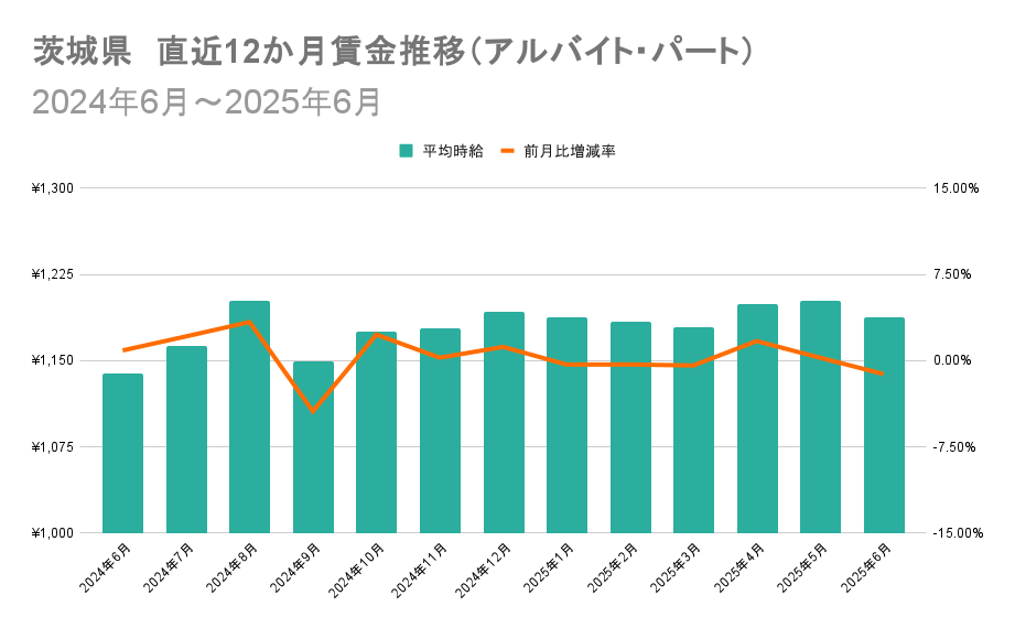 茨城県の平均時給は、2024年6月から同年にかけて大きく上昇し、同年9月にかけて減少。以後は横ばいでの推移を見せています。