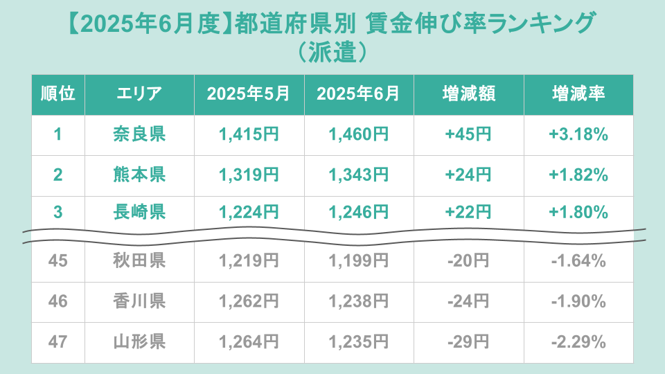 派遣の都道府県別賃金伸び率ランキング(前月比)トップ3は、1位が奈良県(増加額+45円、増加率+3.18%)、2位が熊本県(増加額+24円、増加率+1.82%)、3位が長崎県(増加額+22円、増加率+1.80%)でした。