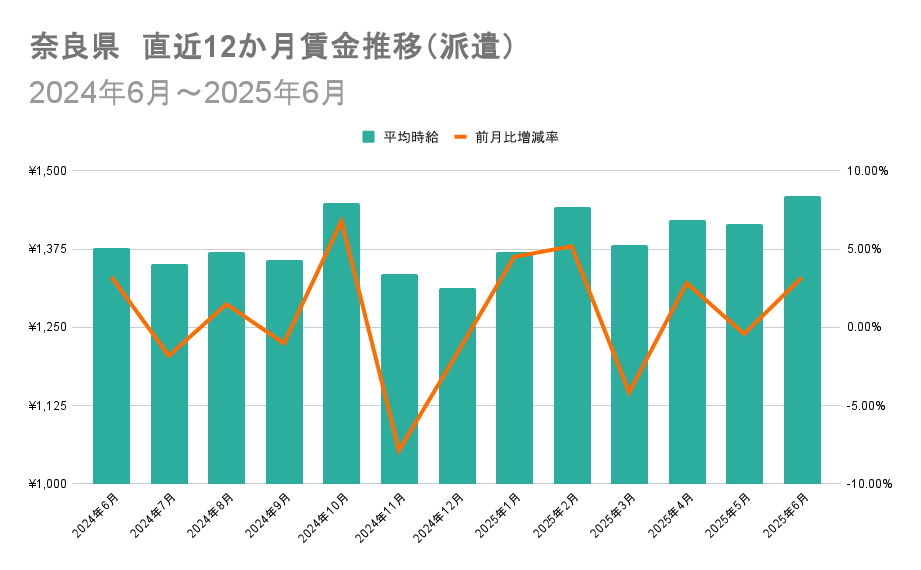 1位の奈良県と47位の山形県における直近12か月の賃金推移を比較すると、奈良県では特定の派遣企業が複数出稿していた時給下限平均1500円および2100円以上の介護系求人の掲載終了が影響し、平均時給が大きく減少。以後は増減を繰り返しながら平均時給1,500円に近づく勢いで推移しています。