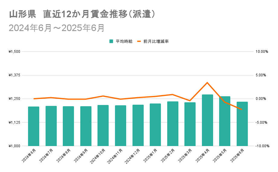 山形県では、2025年3月から同年4月への上昇を除き、平均時給はほぼ横ばいで推移しています。