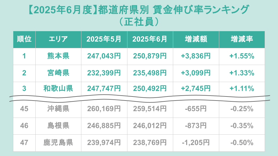 正社員の都道府県別賃金伸び率ランキング(前月比)トップ3は、1位が熊本県(増加額+3,836円、増加率+1.55%)、2位が宮崎県(増加額+3,099円、増加率+1.33%)、3位が和歌山県(増加額+2,745円、増加率+1.11%)でした。