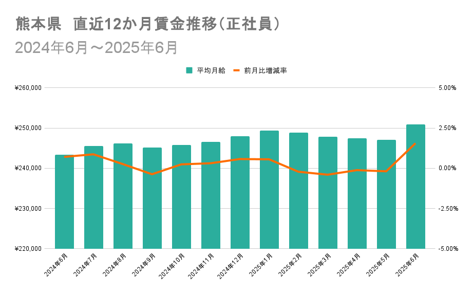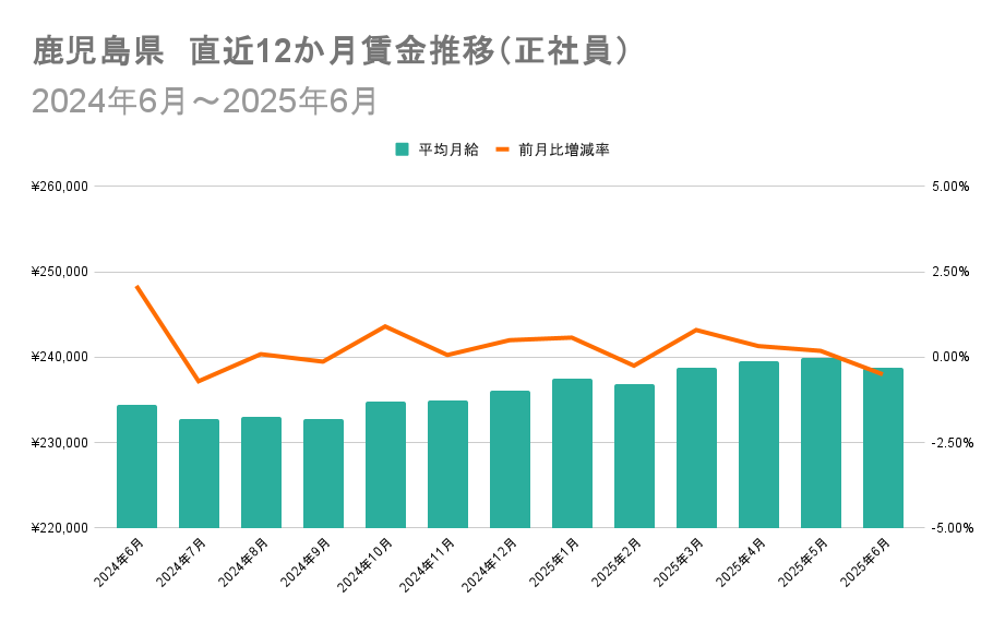 鹿児島県の平均月給は、2024年6月から同年9月にかけて減少傾向にあったものの、2024年10月からは緩やかな上昇を続けています。