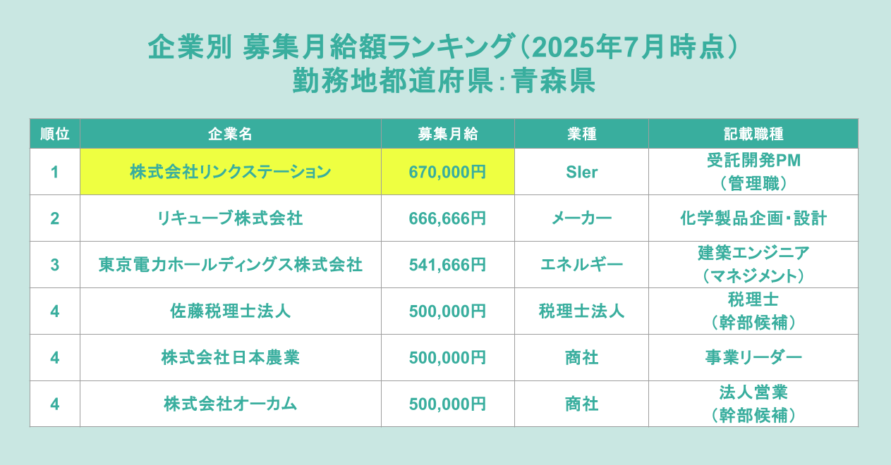 最後に、1位となった青森県について企業別に募集月給を見てみると、1位は「株式会社リンクステーション」で、月給は119万7000円でした。2位は「リキューブ株式会社」の66万6666円、3位は「東京電力ホールディングス株式会社」の54万1666円、4位には「佐藤税理士法人」「株式会社日本農業」「株式会社オーカム」の3社が50万円でランクインしました。