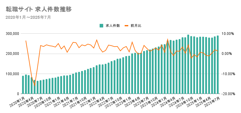 2025年7月時点の求人件数は290,067件(前月比+1.34%)となり、2020年1月の90,230件から5年半で+199,837件(+221.48%)の増加となりました。