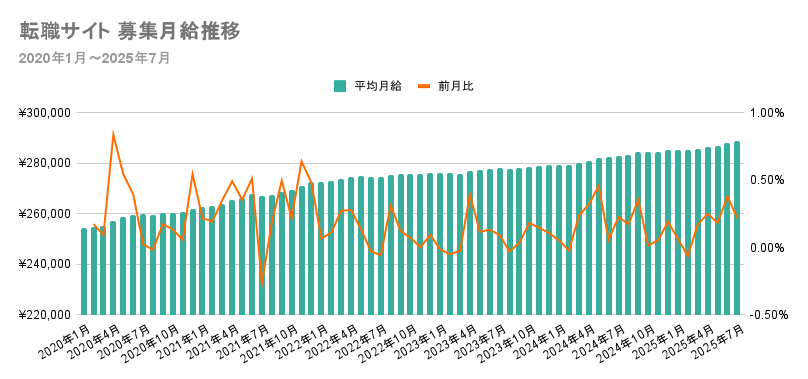 ・転職市場全体での募集月給は、2025年7月までの5年半で+13.43%上昇し、28万8623円となった。