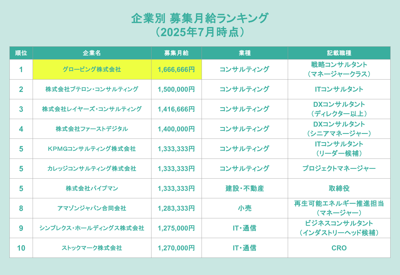1位には「グロービング株式会社」がランクインし、月給は166万6666円でした。続いて2位は「株式会社プテロン・コンサルティング」で月給150万円、3位は「株式会社レイヤーズ・コンサルティング」が141万6666円、4位は「株式会社ファーストデジタル」が140万円となっています。