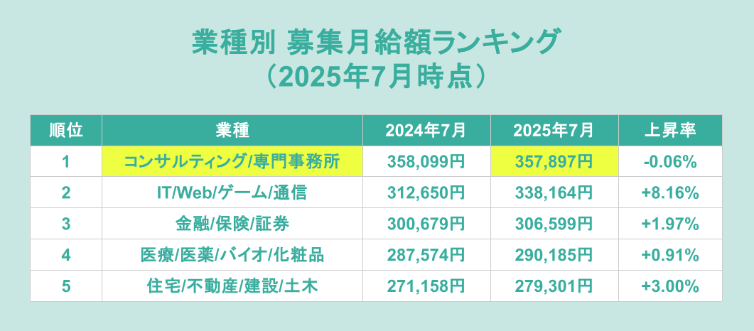 2024年7月から2025年7月にかけての上昇率で見ると、「IT/Web/ゲーム/通信」が+8.16%の上昇で最も高く、続いて「住宅/不動産/建設/土木」が+3.00%、「金融/保険/証券」が+1.97%、「医療/医薬/バイオ/化粧品」が+0.91%の上昇となりました。一方、「コンサルティング/専門事務所」はわずかに-0.06%の減少となっています。
