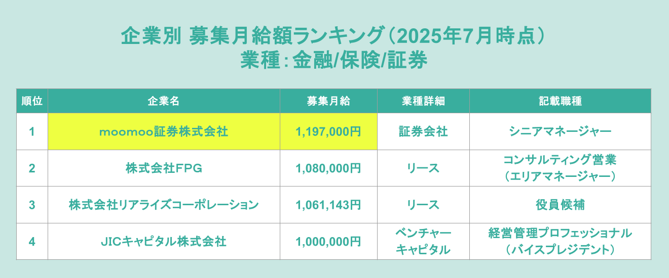 1位は「moomoo証券株式会社」で、月給は119万7000円と圧倒的な高水準。2位「株式会社FPG」は108万円、3位「株式会社リアライズコーポレーション」は106万1143円、4位「JICキャピタル株式会社」は100万円でした。いずれも幹部候補や専門職の求人で、100万円超の高水準が目立ちます。
