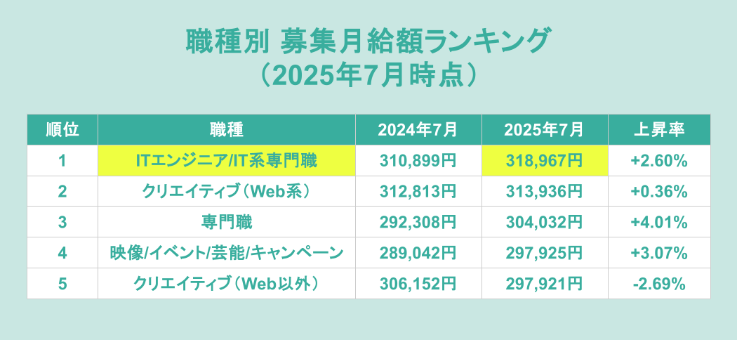 2024年7月から2025年7月にかけての上昇率を見ると、「専門職」が+4.01%で最も高く、次いで「映像/イベント/芸能/キャンペーン」が+3.07%、「ITエンジニア/IT系専門職」が+2.60%、「クリエイティブ(Web系)」が+0.36%の上昇となりました。一方、「クリエイティブ(Web以外)」は-2.69%の減少を示しています。
