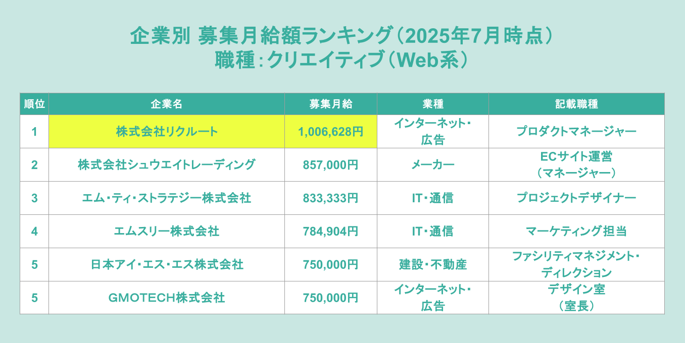 ITエンジニア職に次いで2位にランクインしたWeb系クリエイティブ職の募集月給を企業別に調査してみると、1位は「株式会社リクルート」で、月給は100万6628円となっています。2位は「株式会社シュウエイトレーディング」の85万7000円、3位は「エム・ティ・ストラテジー株式会社」で83万3333円、4位は「エムスリー株式会社」の78万4904円、5位には「日本アイ・エス・エス株式会社」と「GMOTECH株式会社」がともに75万円で並びました。