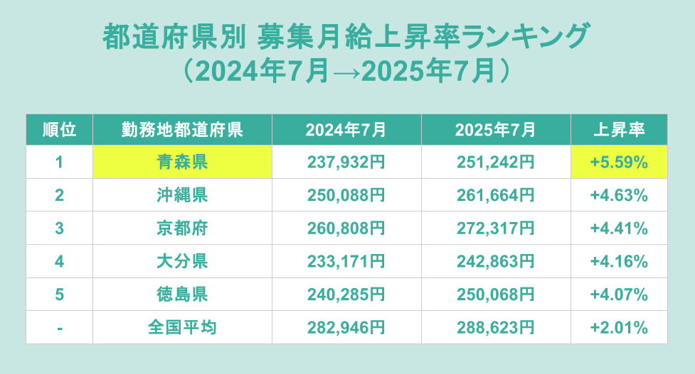 全国平均の上昇率は+2.01%(28万8623円)となりました。今回ランクインした都道府県では、月給額自体は全国平均を下回るものの、上昇率については全国平均を上回る伸びを示していることがわかります。この結果から、賃金水準の高い地域に比べて地方では賃金の伸びがより顕著であり、地方の求人市場においても採用競争の激化や人材確保のための待遇改善が積極的に進んでいることがうかがえます。
